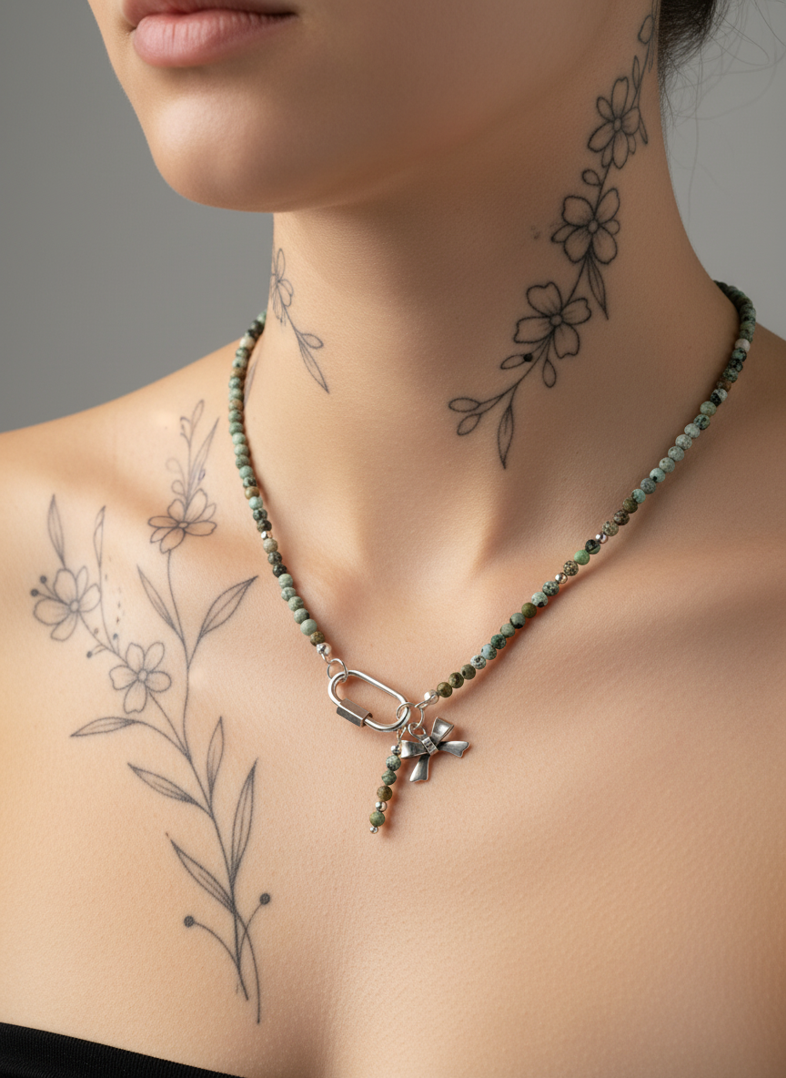 The necklace is crafted from tiny faceted turquoise gemstone beads (around 3.5mm) and finished with a secure stainless steel carabiner clasp. The turquoise beads, delicately strung together, vary in tones and form a seamless cascade that drapes gracefully along the neckline. The necklace is adorned with a stainless steel carabiner clasp and tiny bowknot pendant, adding a contemporary twist to its timeless beauty.